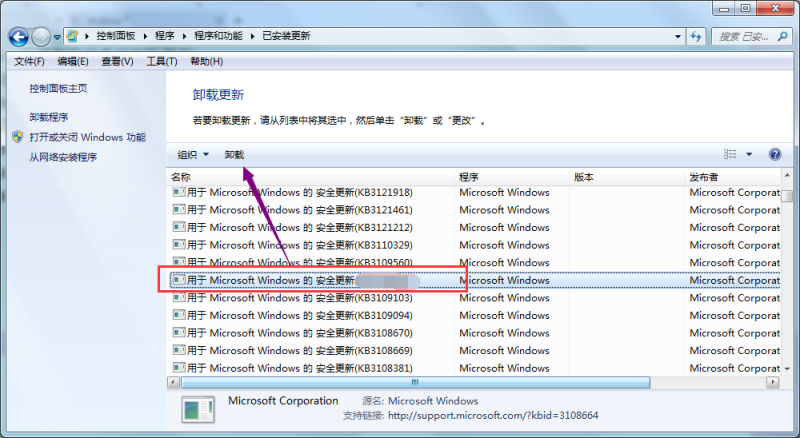2)然后在右侧找到对应的更新,小编这里并没有更新,小伙伴们要注意找到对应的安全更新,最后点击左上角的“卸载”即可。